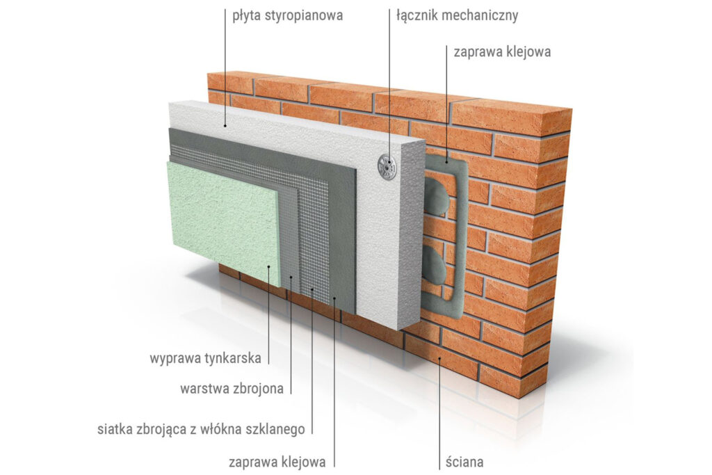 - Montaż listwy startowej (cokołowej): Listwę montuje się nad cokołem, precyzyjnie ją poziomując. Stanowi ona oparcie dla pierwszej warstwy termoizolacji i zabezpiecza ją przed gryzoniami.